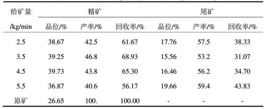 單位時(shí)間內(nèi)的給礦量對(duì)磁選設(shè)備分選效果的影響也較大。給礦量過(guò)大會(huì)使轉(zhuǎn)環(huán)的負(fù)荷較大,同時(shí)容易造成介質(zhì)堵塞,增加夾帶情況的發(fā)生和目的礦物的損失;給礦量過(guò)小又會(huì)使處理量減小,分選系統(tǒng)的使用不能完全發(fā)揮出來(lái),造成效率低下,因此通過(guò)試驗(yàn)找到適當(dāng)?shù)慕o礦量也是非常有必要的。